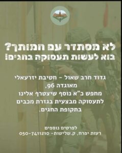 עבור רבים, כך לפחות הם מעידים, אחד ה'מוקשים' בחגים הוא אירוח החותנת או התארחות אצלה. ללכת על קצות האצבעות כל היום, להיות מנומסים, לא תמיד זה קל. אבל – זה מה יש (גילוי נאות: לצערי, לי כבר אין חותנת…). כך או אחרת, אם אתה היית לוחם במילואים, גם אם מפאת גיל שוחררת, ואתה בכושר סביר, ומחפש פתרון לסוגיית החותנת – קח ברצינות את הכתוב במודעה שלפניך, שרצה ברשתות. כך, תרוויח שתי ציפורים במכה: גם פטור מהחותנת, וגם תקיים מצווה של הגנה על ארץ ישראל (ובעיניים שלי, כואב לקרוא על צורך ב'שנור' של אנשים למילואים).